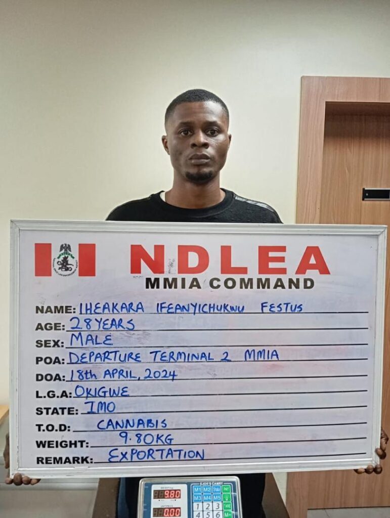 Babafemi said an attempt by a suspect, Iheakara Ifeanyichukwu to export a drug consignment through the terminal 2 of the Lagos airport to Muscat, Oman via Ethiopian airline flight last Thursday was thwarted by NDLEA officers. When his luggage was searched, 20 big parcels of cannabis weighing 9.80 kilogrammes were discovered concealed in his bag.