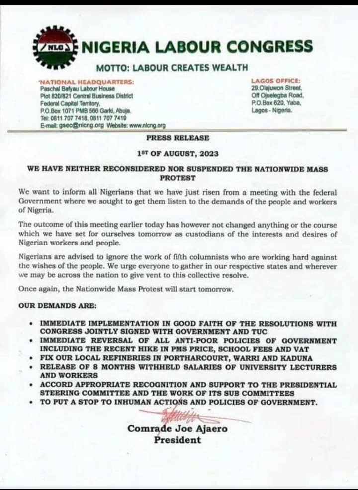 “The outcome of this meeting earlier today has however not changed anything or the course which we have set for ourselves tomorrow as custodians of the interests and desires of Nigerian workers and people.