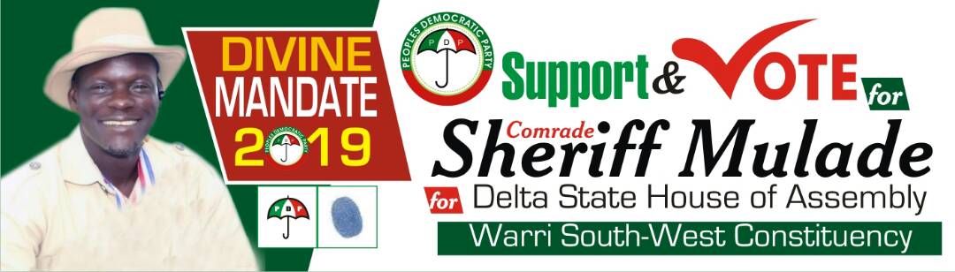 High Chief Bobo, who is from Gbaramatu kingdom, Warri South West Council Area, said, “The reason and purpose of the visit is to come and present Sheriff Mulade to you my brothers and sisters to support him. He is your son and as we are detribalised people, we felt that it was necessary to pay you this visit. We just want the right person to represent Warri South West and bring development to the area.”