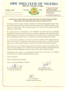 The Odu Oma Club of Nigeria has extended heartfelt congratulations to Senator Ned Nwoko and members of the technical committee on the creation of Anioma State, commending the significant progress made toward the long-standing goal of establishing Anioma as Nigeria’s 37th state.