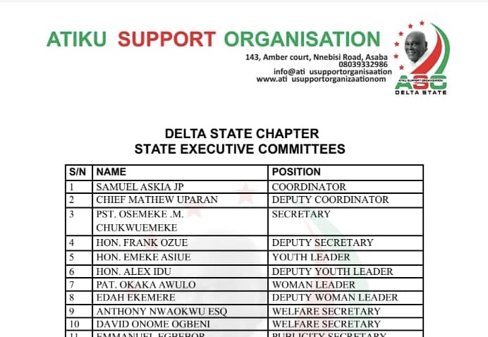 The Delta State Chapter of Atiku Support Organisation has released the list and organisational structure of working committee which is headed by the State Executives council with members drawn from across the twenty five local government areas of the state.
