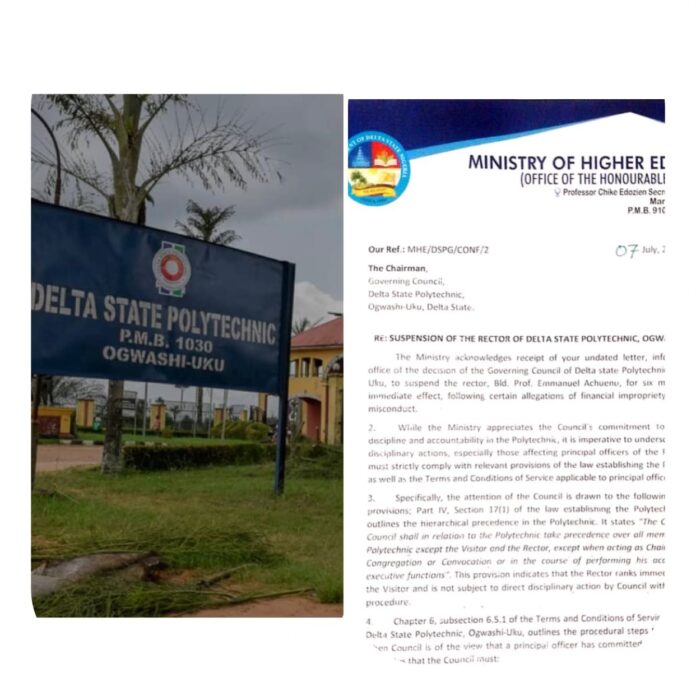 The letter , titled RE: SUSPENSION OF THE RECTOR OF DELTA STATE POLYTECHNIC , OGWASHI-UKU, reads in part : “While the Ministry appreciates the Council,s commitment to upholding discipline and accountability in the Polytechnic, it is imperative to underscore that all disciplinary actions , especially those affecting Principal officers of the Polytechnic , must comply with relevant provisions of the law establishing the Polytechnic , as well as the Terms and Conditions of Service applicable to Principal officers. Specifically , the attention of the Council is drawn towards the following statutory provisions : Part 1V, Section 17 (1) , of the law establishing the Polytechnic which states , “The Chairman of Council shall in relation to the Polytechnic , take precedence over all members of the Polytechnic , EXCEPT the Visitor and the Rector, except when acting as Chairman of the Congregation or Convocation , or in the course of performing his academic and executive functions”