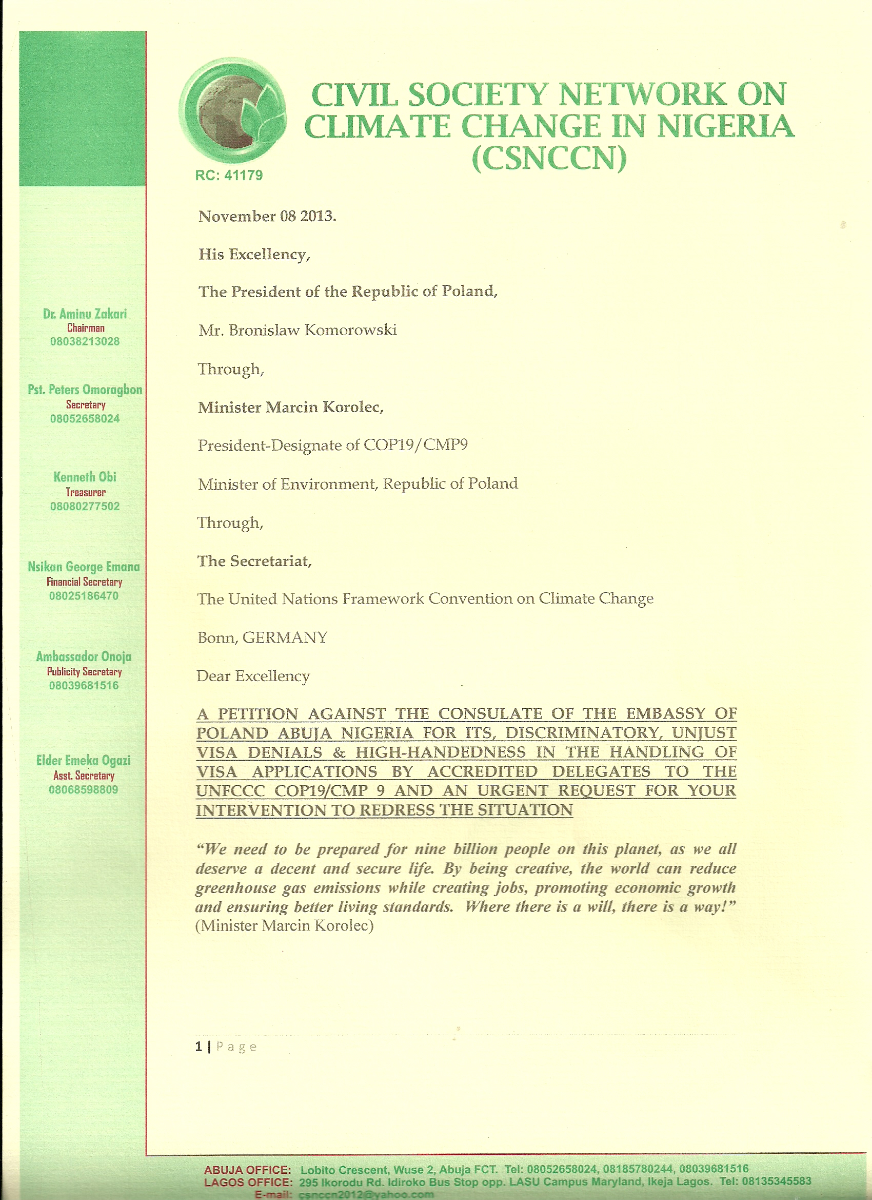 I forward herewith, an URGENT Petition JOINTLY signed by the ENTIRE Civil Society Network on Climate Change in Nigeria against the high-handedness, racial discrimination and unsavoury diplomatic passe by the Consulate of the Embassy of Poland, Abuja Nigeria.
