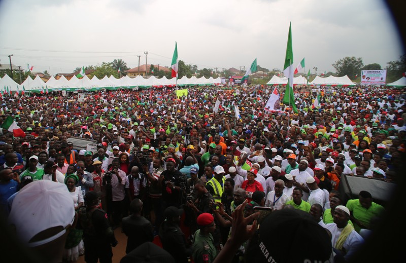 THOUSANDS of Deltans on Tuesday defied heavy down-pour to attend the campaign rally of the Peoples Democratic Party (PDP) in Ughelli South with excited Governor Ifeanyi Okowa expressing joy that Deltans are appreciating the development projects of his administration.