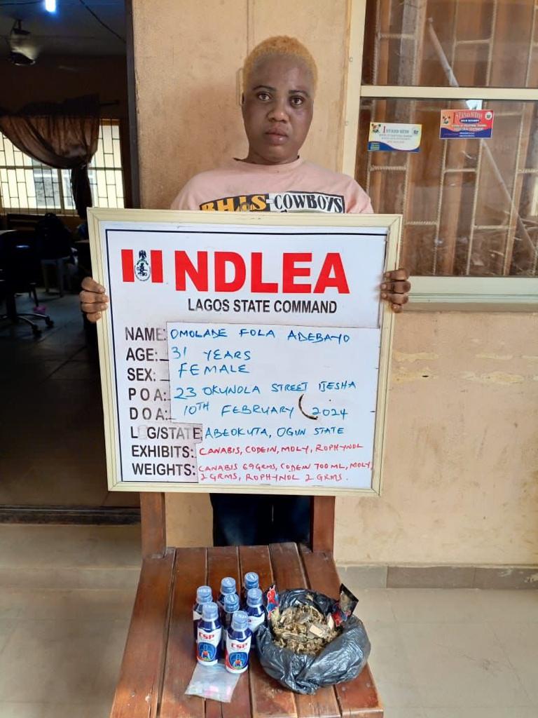 Omolade Adebayo, according to him, was nabbed at Ijesha with various quantities of cannabis, codeine syrup, rohypnol and molly.
