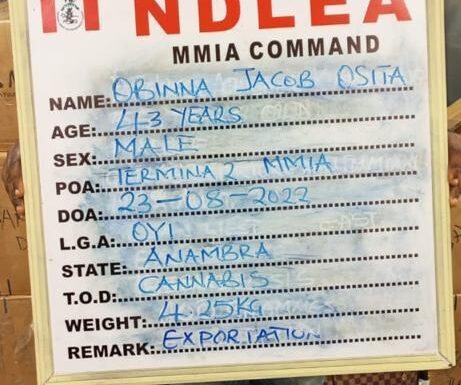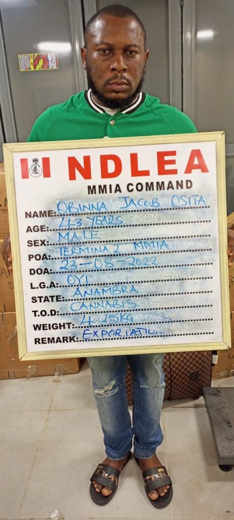 A statement on Sunday by the spokesman of the anti-narcotics agency, Femi Babafemi said Ohiagu was nabbed last Tuesday following the arrest of an intending passenger on Air Peace flight to Dubai, UAE, Obinna Osita who was arrested with three bags, two of which contained eight blocks of cannabis sativa weighing 4.25 kilogrammes concealed in cassava product, gari and crayfish.