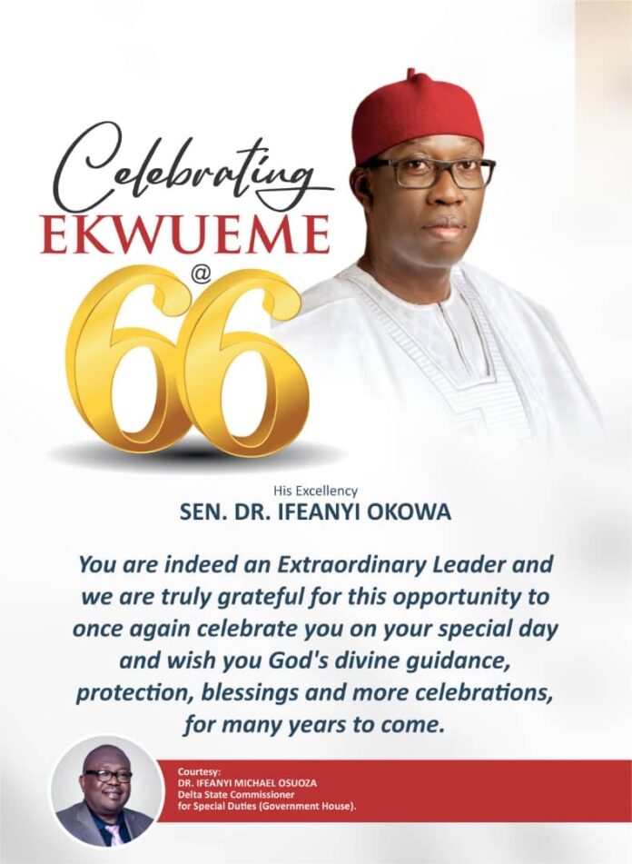 Delta State Commissioner for Special Duties (Government House), Dr. Ifeanyi Osuoza has felicitated the immediate past Governor of the State, Senator, (Dr.) Ifeanyi Okowa on the occasion of his 66th birthday, describing the former Governor as a visionary leader, whose indelible impact and astute acumen continues to be relevant in the State.