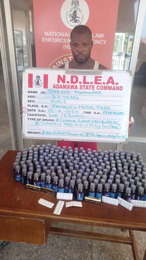 Babafemi revealed that In Adamawa state, NDLEA operatives last Saturday intercepted a Peugeot car driven by Dahiru Mohammed at Girei on his way to Mubi with 1,250,000 pills of opioids weighing 450 kilogrammes. The operatives had earlier intercepted along Ngurore -Yola road a J5 bus marked AAA790XV loaded with motor spare parts from Onitsha, Anambra State, with consignments of codeine syrup and tramadol concealed in-between the motor parts. A follow up operation led to the arrest of the recipient, Jairus Nwanchor at Jambutu motor park .