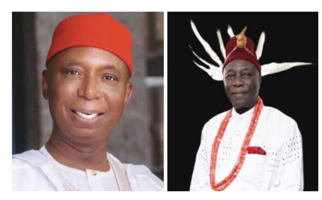 Senator Ned Nwoko salutes Obi (Prof) Epiphany Azinge on his coronation as 14th Asagba of Asaba
