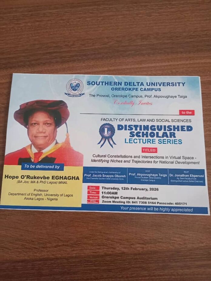 The Orerokpe Campus of Southern Delta University, Ozoro, will hold her first distinguished scholar lecture on Thursday, 13th February 2026, at the university Auditorium.
