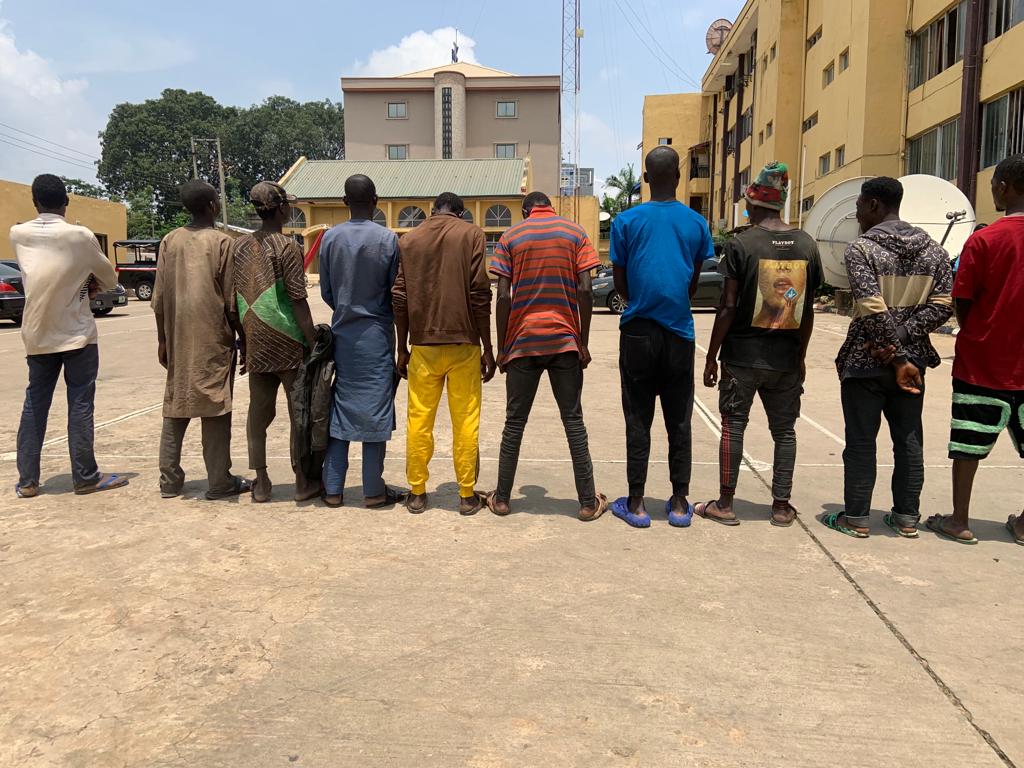 The suspects are: Muhammed Isa, ‘M’, 18, Elvis Obingwa, ‘M’, 45, Eze Godwin, ‘M’, 39, Basiru Abubakar, ‘M’, 23, Abdallah Zakariya, ‘M’, 40, Hungano Dimas ‘M’ 27, Aliyu Mohammed ‘M’ 52, Basiru Abdullah ‘M’ 20, Kabiru Usenu ‘ M’ 19,